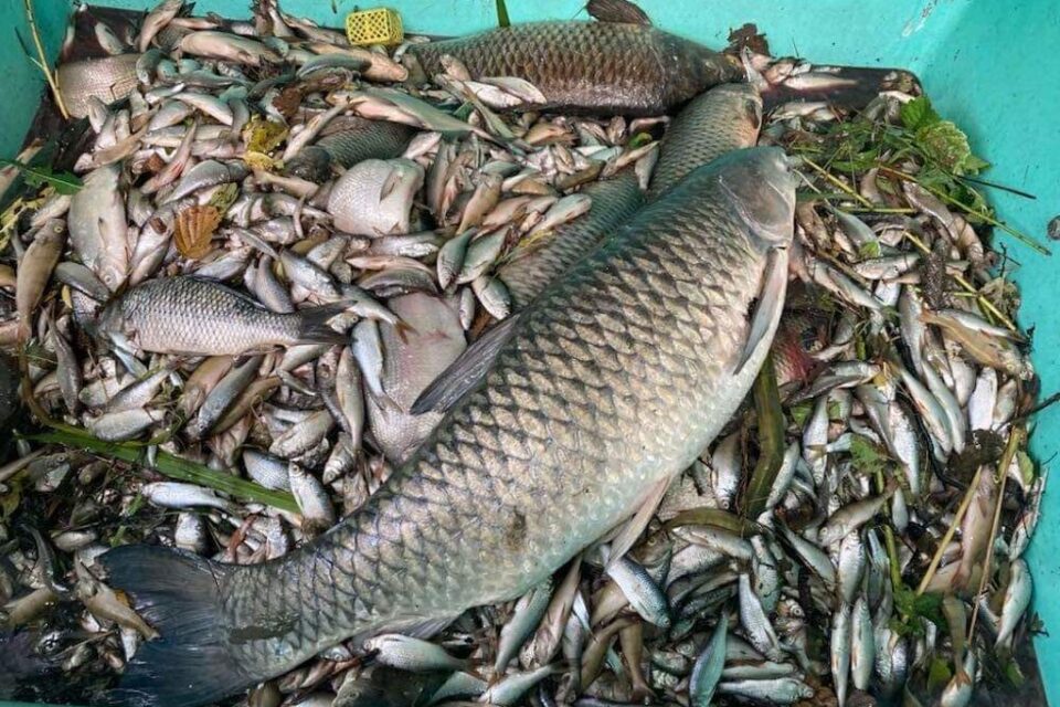 L’eau est marron. Depuis 6 jours, des poissons comme des carpes et des écrevisses remontent progressivement à la surface. 400 kg de poisson retrouvés morts dans l'étang communal de Lapenty