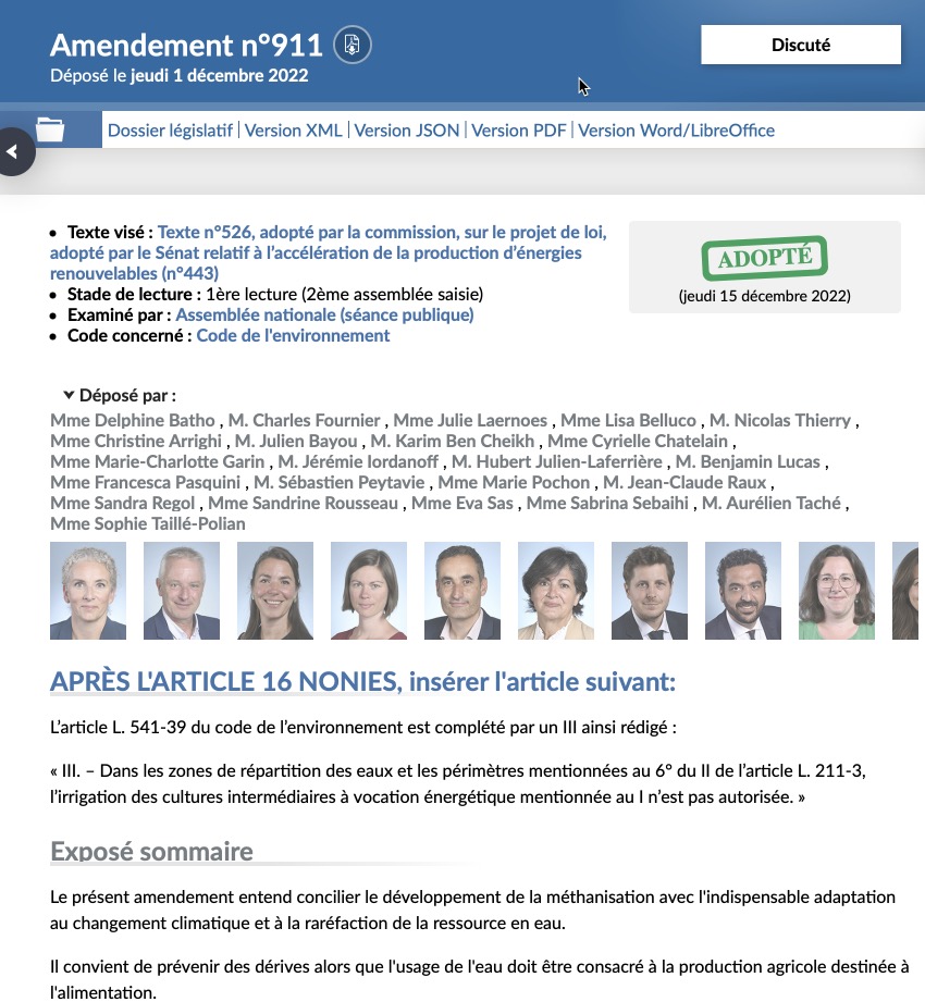 « Le présent amendement, expliquent ces députés, entend concilier le développement de la méthanisation avec l’indispensable adaptation au changement climatique et à la raréfaction de la ressource en eau. Il convient de prévenir des dérives alors que l’usage de l’eau doit être consacré à la production agricole destinée à l’alimentation. »