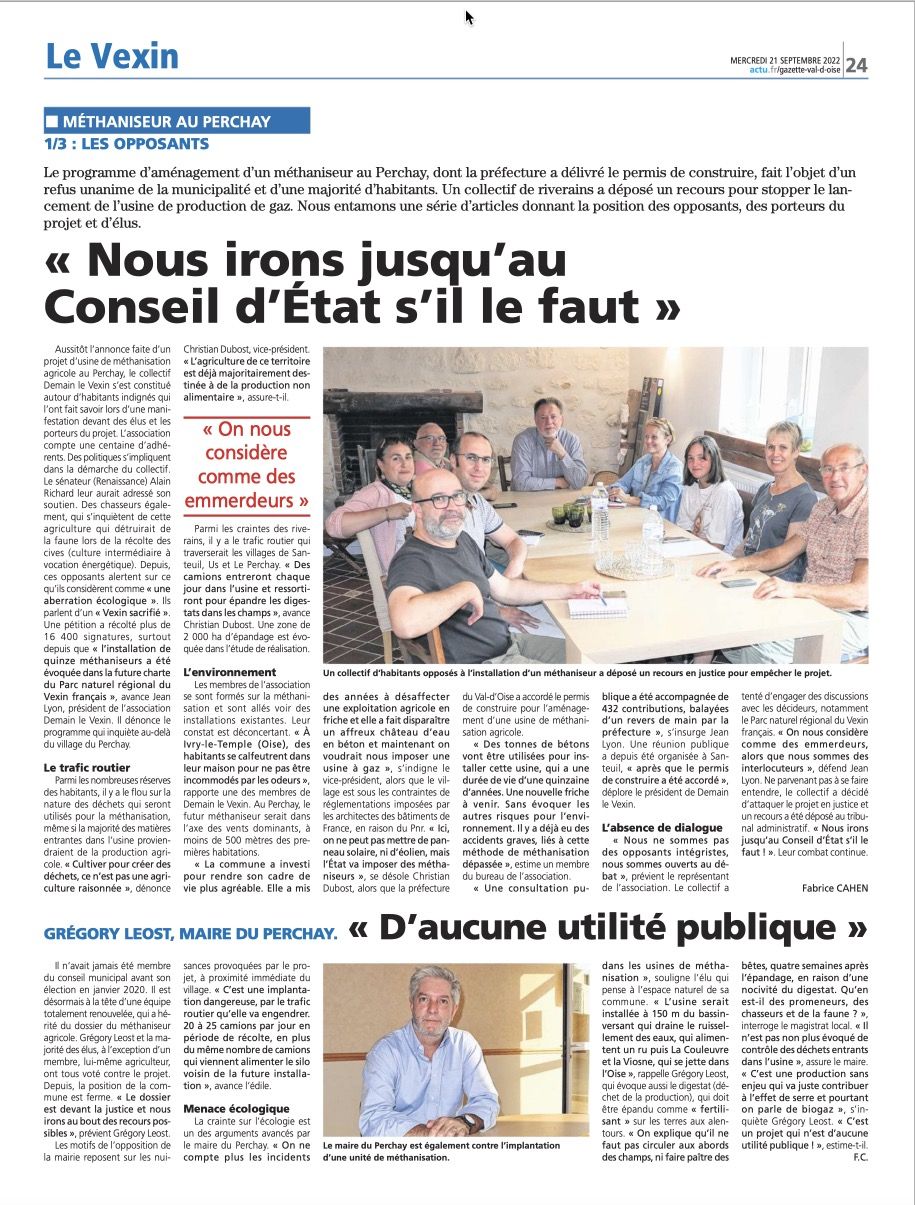 Aussitôt l’annonce faite d’un projet d’usine de méthanisation agricole au Perchay, le collectif Demain le Vexin s’est constitué autour d’habitants indignés qui l’ont fait savoir lors d’une manifestation devant des élus et les porteurs du projet. L’association compte une centaine d’adhérents. Des politiques s’impliquent dans la démarche du collectif. Le sénateur (Renaissance) Alain Richard leur aurait adressé son soutien. Des chasseurs également, qui s’inquiètent de cette agriculture qui détruirait de la faune lors de la récolte des cives (culture intermédiaire à vocation énergétique). Depuis, ces opposants alertent sur cequ’ils considèrent comme « une aberration écologique ». Ils parlent d’un « Vexin sacrifié ». Une pétition a récolté plus de 16 400 signatures, surtout depuis que « l’installation de quinze méthaniseurs a été évoquée dans la future charte du Parc naturel régional du Vexin français », avance Jean Lyon, président de l’association Demain le Vexin. Il dénonce le programme qui inquiète au-delà du village du Perchay.