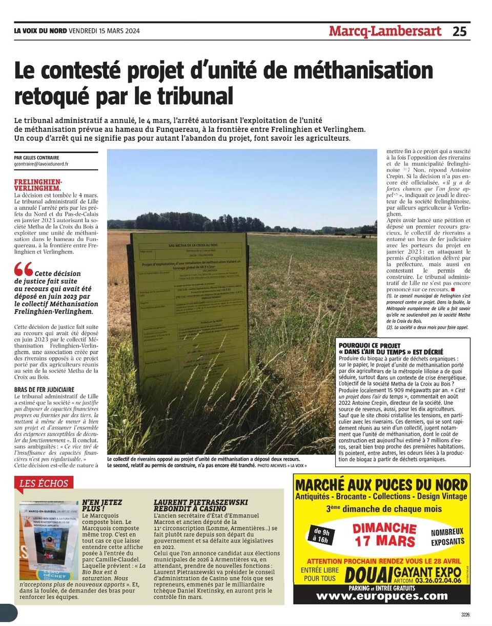 Le tribunal administratif a annulé, le 4 mars, l’arrêté autorisant l’exploitation de l’unité de méthanisation prévue au hameau du Funquereau, à la frontière entre Frelinghien et Verlinghem.