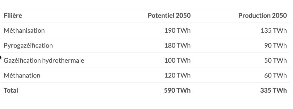 En 2020, la consommation de gaz naturel en France était de 494 TWh. Compte tenu des divers modes de fabrication possibles, l’AFG évalue la capacité française de production de biométhane à 335 TWh à l'horizon 2050. De quoi couvrir 70 % de la demande par rapport à 2020 et, au vu de la dynamique inéluctable de réduction des consommations, probablement la quasi-totalité des besoins.