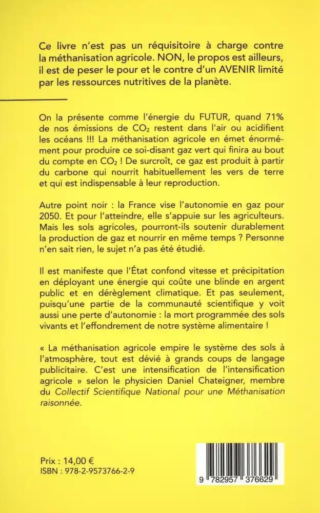 Christophe Gatineau a grandi dans le milieu agricole et prend la précaution dès les préambules de son livre de ne pas incriminer les agriculteurs. « On encourage les agriculteurs à investir dans la méthanisation parce que c’est rentable pour eux ; produire du gaz de méthane aujourd’hui rapporte plus que de produire du lait. La bouse de vache a plus de valeur que le lait que l’animal produit », sourit l’auteur. « On a une pression sur le sol pour produire de l’énergie, on s’éloigne du coté nourricier, dans 30 ans ça va poser des problèmes. Quand il n’y a pas de l’énergie dans le sol, plus rien n’y pousse. On dit aux agriculteurs produisez de l’énergie du gaz, de l’électricité et des biocarburants, avec l’énergie de leur sol, sauf qu’à terme quand les sols seront pauvres on ne pourra plus les exploiter. Il suffit d’observer les déserts, qui ont été des régions fertiles, le sol qui nous nourrit est une ressource rare, qui n’est pas renouvelable. On devrait en prendre soin » argumente l’agronome. Christophe Gatineau s’appuie sur des travaux de chercheurs comme Daniel Châtaignier pour étayer ses arguments. « J’ai travaillé avec Daniel Châtaignier qui est physicien, il a validé le contenu scientifique du livre. » Il est chercheur à l’université de Caen Normandie. Avant le livre, Christophe Gatineau a entretenu des échanges réguliers avec ce physicien autour du climat, de la méthanisation et des gaz à effet de serre. C’est un travail qui a duré un an d’investigation. Le professeur est aussi coordinateur du Collectif Scientifique National pour une méthanisation raisonnable.