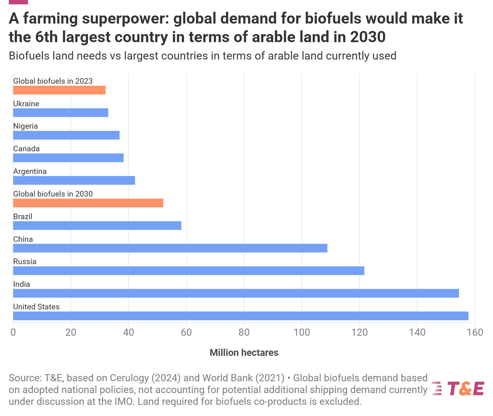 Source : T&E, sur la base de Cerulogy (2024) et de la Banque mondiale (2021) • La demande mondiale de biocarburants basée sur les politiques nationales adoptées, sans tenir compte de la demande supplémentaire potentielle de transport maritime actuellement ₴ T&E en discussion à l’OMI.