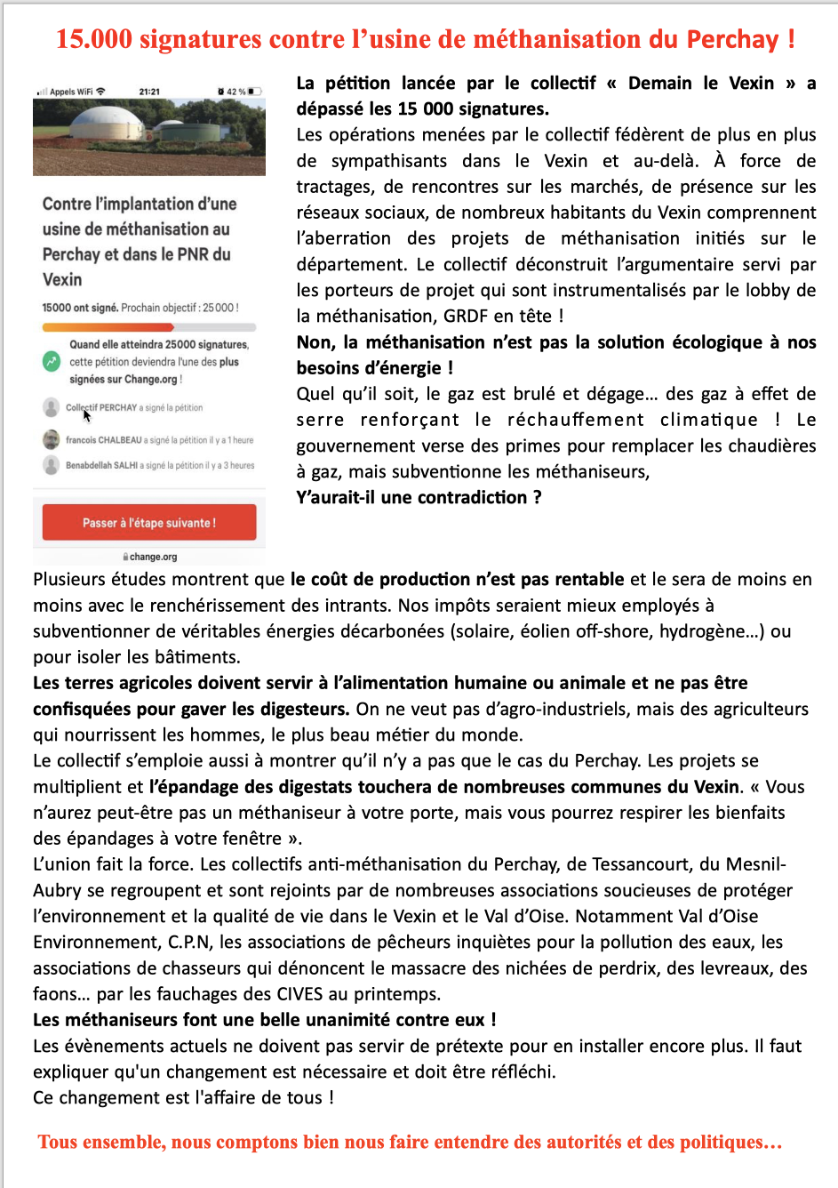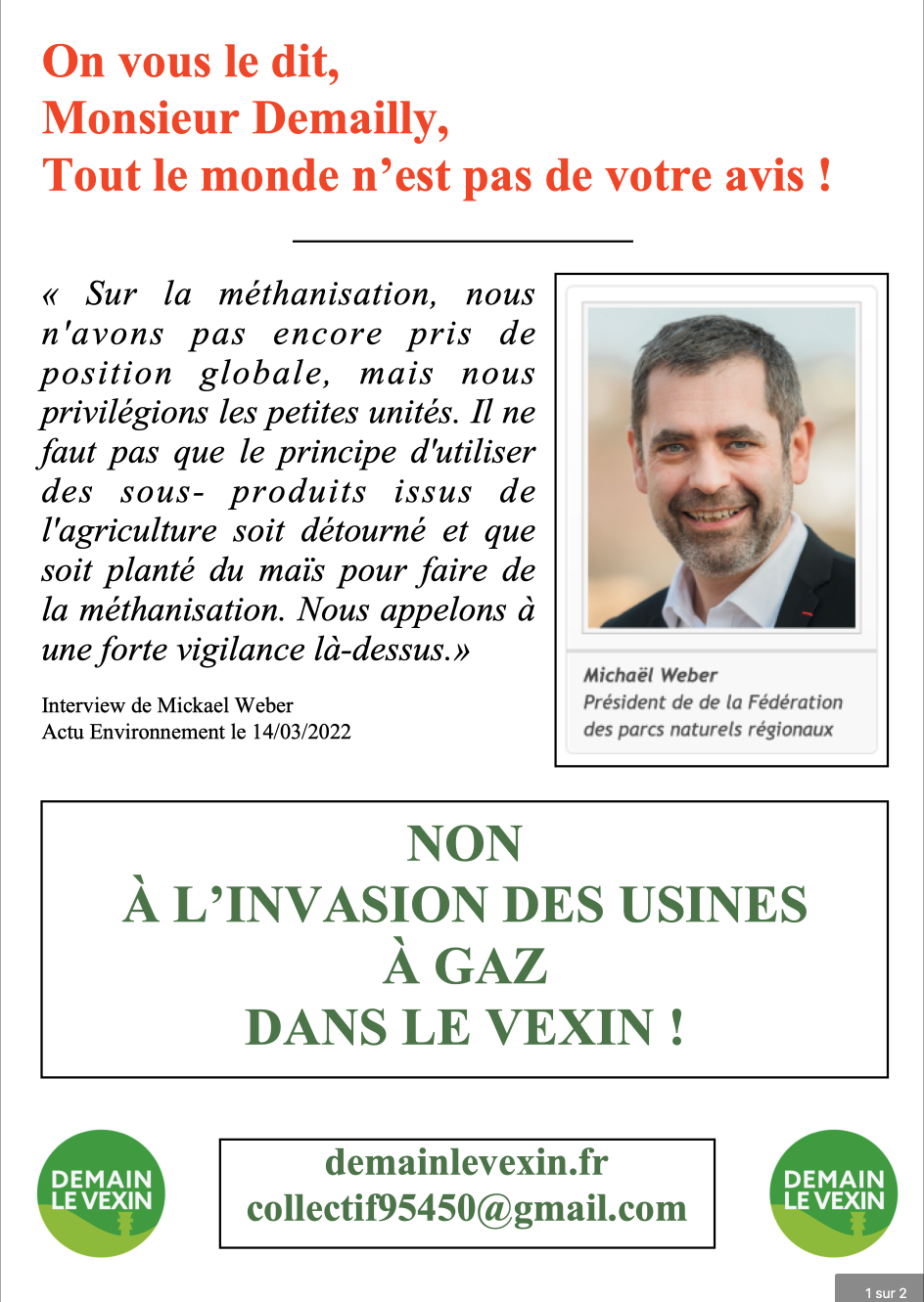 Le président du Parc National Régional du Vexin est venu présenter sa nouvelle charte « Horizon 2040 » dans laquelle il a introduit discrétement en page 274, annexe 11, paragraphe 9.2 en caractère 7px la possibilité décrite comme « stratégique » d'installer 10 à 15 installations industrielles de méthanisation sur le territoire du PNR.